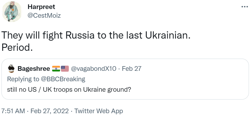 As I mentioned before, Ukraine seems to be winning this war quite handsomely, atleast on social media. But then (and I may be totally wrong), when Russians enter Kyiv, the heartbreak will be even more intense.