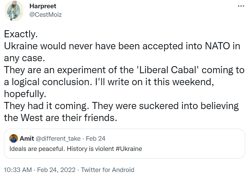 I personally believe that this conflict (not specifically the Ukraine situation) was already in the making over the past decade and half or so since ‘liberalism’ became the flavour of the day. But I also believe it was mostly being shaped in the cognitive domain without any overt involvement of National militaries in the physical domain. It was a war of narratives thus far which has now, for a change, turned kinetic with both sides being sovereign Nations. Yet, some ppl continue to feel happy in the cognitive domain!