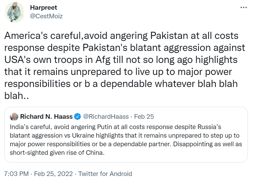Personally, my own take is – ‘Not my dog, Not my fight’. I think the GOI too did its bit by abstaining in the UNSC vote.