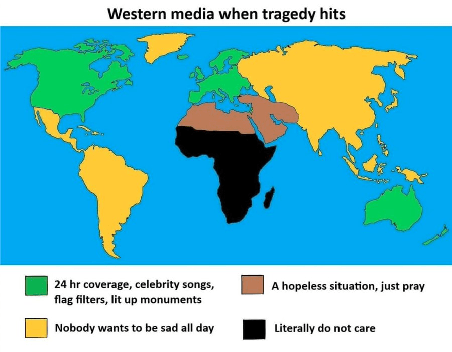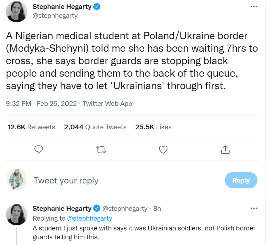 Come what may, Ukraine just HAS to be painted as innocent victims of Russian aggression without telling people why Russia invaded in the first place. Also, ‘non-white’ people being prevented from leaving Ukraine by gunmen who should instead be fighting Russia, is given a miss!
