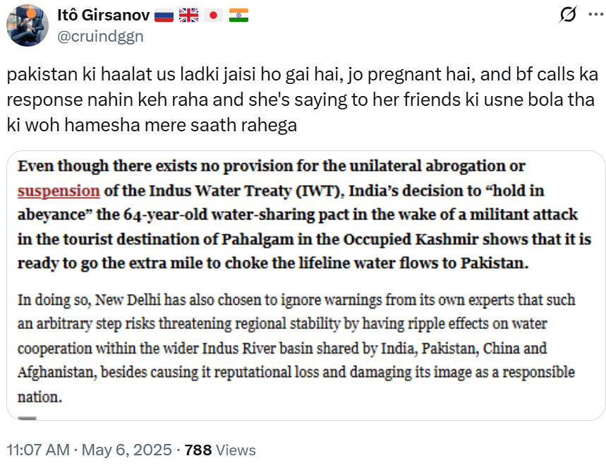 They said putting IWT on hold was an act of war. I wonder what they thought on the night Indian bombs/missiles came calling, heralding Op Sindoor!