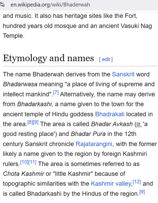 Bhaderwah was BhadarKashi. The town is variously referred to as Bhadarwasa, Bhadarkashi, Bhadar Avakash and Bhadar Pura. Here is an extract from the Wikipedia page on Bhaderwah: