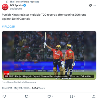 TOI Sports Tweet (1Mn Followers), retweeted here by Times of India Main Handle (14.8Mn Followers). Yet it has just 1 Retweet (that too from the Parent TOI handle) and 01 Like. Moreover, only 6104 views