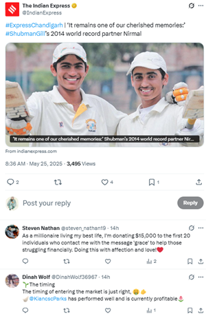 The Indian Express (4.2Mn Followers). Two Replies (both spam!), Four Likes and One Bookmark. And only 3495 Views.