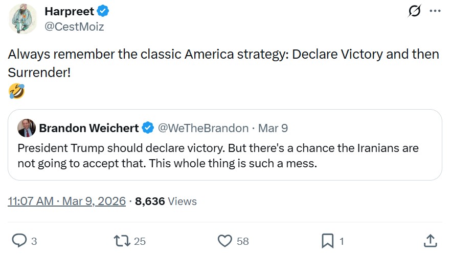 Dare I say, with Iran still fighting and Strait of Hormuz still closed, they have already lost.